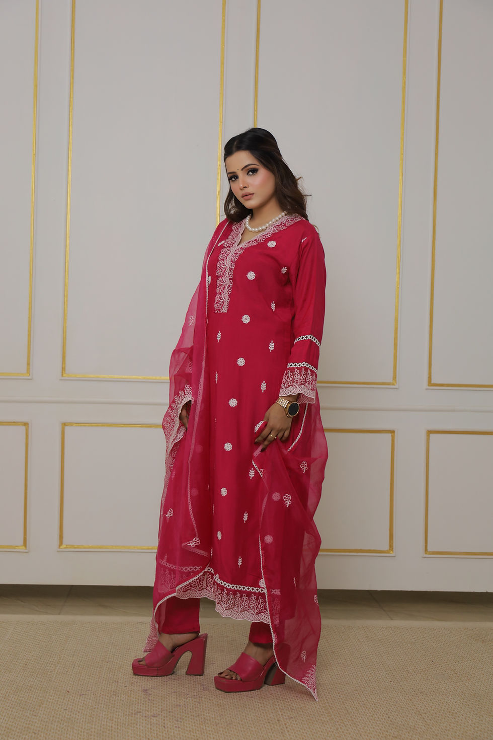 D.No-3067 - Muslin Kurti Pant Set with Organza Dupatta